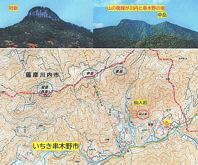 | 「此嶽は,日置薩摩の両郡に連り,其層巒疊嶂東は入来邑西北は當邑に蟠りて,當邑の内,靑峰特に秀抜して三嶽の名を分つ…」 ・ 現代語訳:この山は,日置郡と薩摩郡の二つの郡にまたがって連なっていて,その幾重にも重なった山並みは,東は入来の村にまで,西北はこの村のあたりまで伸びている。この村の中では,とくに青々とした峰がひときわ抜きん出て「三嶽」という名があります。 ~中略~ 「西嶽の形,風折烏帽子に似たり,故に冠嶽と稱ず隈之城沸生橋の道路及び市來薩摩渡瀬橋の堤より是を望に,特に冠の状をなすといふ,又一説に孝元帝の御宇,秦の徐福来て玉冠を留めし故,冠嶽と稱ずと」 ・ 現代語訳:西の峰の形が,風にあおられて折れ曲がった烏帽子に似ているので「冠嶽」と呼び,隈之城の沸生橋の道や,市来の薩摩渡瀬橋の堤からこの山を眺めると,とくに冠の形をしているのがよく分かるという。また別の説では,孝元天皇(紀元前200年前後の神話の時代)の御代に,秦の徐福が来てこの地に玉で作った冠を残したので,冠嶽と呼ぶようになったと記されています。 |