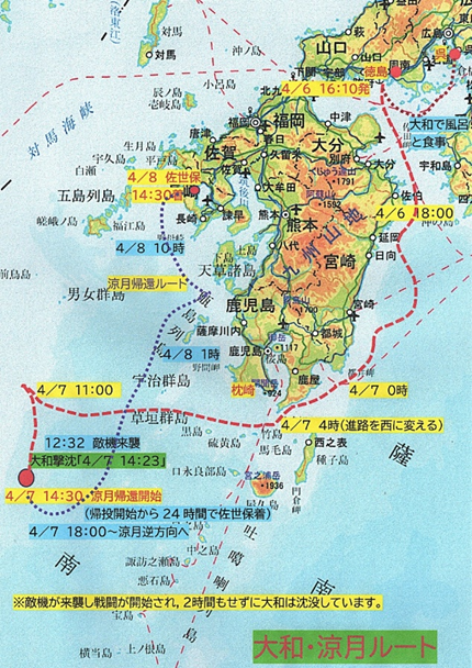 ※ 太平洋戦争末期に実施された沖縄への特攻作戦「天一号作戦」では,出撃艦隊は当初,大隅海峡を南下して沖縄へ向かう計画でした。しかし途中で敵機に発見され,進路を西へ変更します。この時点で作戦はすでに厳しい状況に置かれていました。旗艦大和を中心とする艦隊は出撃から一日足らずで壊滅し,大和も沈没します。一方,駆逐艦涼月は大破しながらも佐世保へ帰還しました。この結末は,制空権を握る米軍と有効な航空援護を欠く日本側との戦力差を如実に示しています。大和の沈没は日本海軍の象徴の終焉であり,戦局の決着がすでに決していたことを物語る出来事であったといえるでしょう。