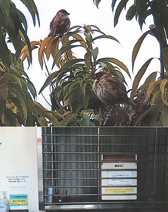 ・ からだを丸め街路樹に留まっていたスズメ(上)とシャッターが下りたフロント(下)。