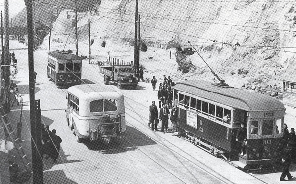 下の写真には,懐かしいチンチン電車と,木炭バスの姿が写っています。昭和30年代までは,木炭バスが黒い煙を上げながら走っており,私も何回か乗った記憶があります。