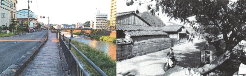 また,川沿いの家々には,万が一に備えて木の船が置かれていたことを思い出します。写真の右手には城山の崖が写っており,防空壕と思われる横穴が四つほど確認できます。この辺りは,かつてローレスポーツセンターがあった場所で,今はマンションになっています。