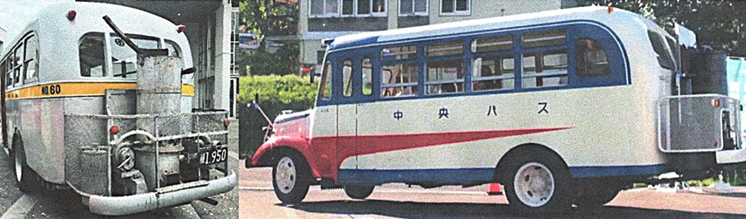 アメリカとの戦争により,日本への石油輸出が全面的に禁止されました。それにより,ガソリンの使用は厳しく制限されました。そんな中,木炭バス(代用燃料車)が庶民の足として活躍しました。ガソリンの代わりに木炭などを使い,熱して発生させたガスをエンジンに送り込んで動かす自動車です。戦後の昭和27年になると,ガソリン配給制や価格統制が撤廃されると,ガソリン車が再び使えるようになり,木炭を燃料にした木炭車はその役目を終えていきました。 それでも,地方へ行くとまだ木炭バスが走っていました。また,途中でエンジンが止まってしまうこともあり,運転手さんと車掌さんが協力して,必死にエンジンを回していたのを覚えています。そして,車内までただよう木炭を燃やした強いにおいが,記憶に残っています。 |