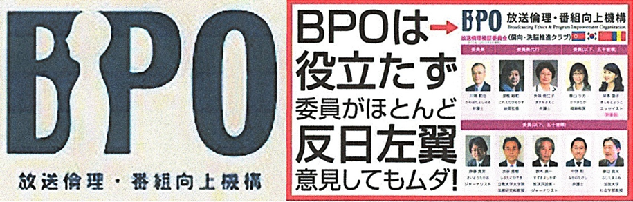 放送倫理・番組向上機構(BPO)のメンバーを見ると,弁護士三人,映画監督,精神科医,エッセイスト,ジャーナリスト二人,大学教授二人という構成です。いずれもテレビでよく見かける方々で,左派的な発言が目立つ人ばかりに思えます。よくもここまで同じ方向の意見を持つ人をそろえたものだと驚かされます。