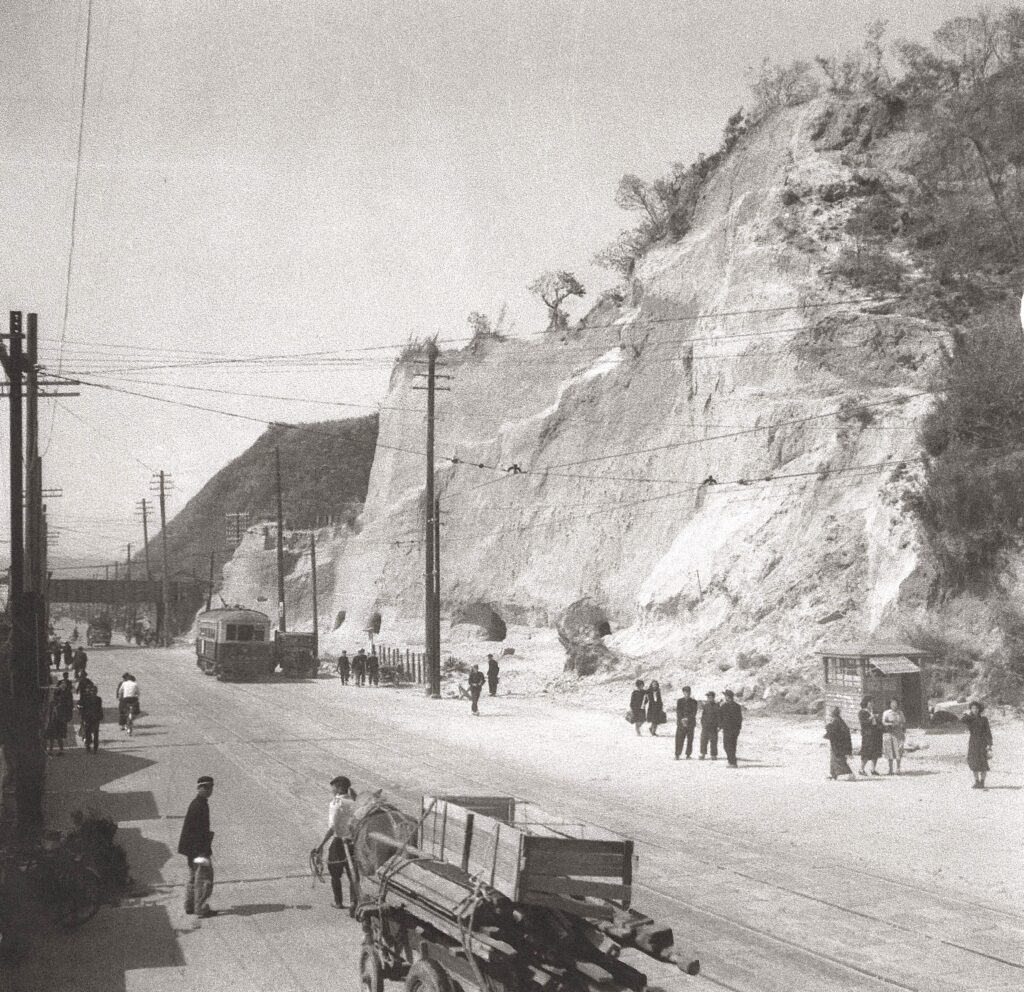 前回は,新上橋のローレ卓球場に関する話の中で,城山の西端尾根のシラスの崖が国道のすぐそばまで迫っていた様子を,昭和22年頃に撮影された一枚の古い写真とともにご紹介いたしました。写真には,防空壕の跡も写っており,戦時中にはこの地で何人もの死者が出たそうです。当時の風景を今に伝える貴重な記録となっています。