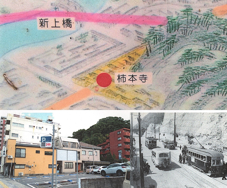 ところで,戦前までは城山登山口近くの新上橋付近には,柿本寺跡の門前から続く柿本寺通りが,高見馬場まで伸びていました。この柿本寺跡は,城下の下方限,現在の鹿児島市平之町にあり,城山の南西麓に位置しています。