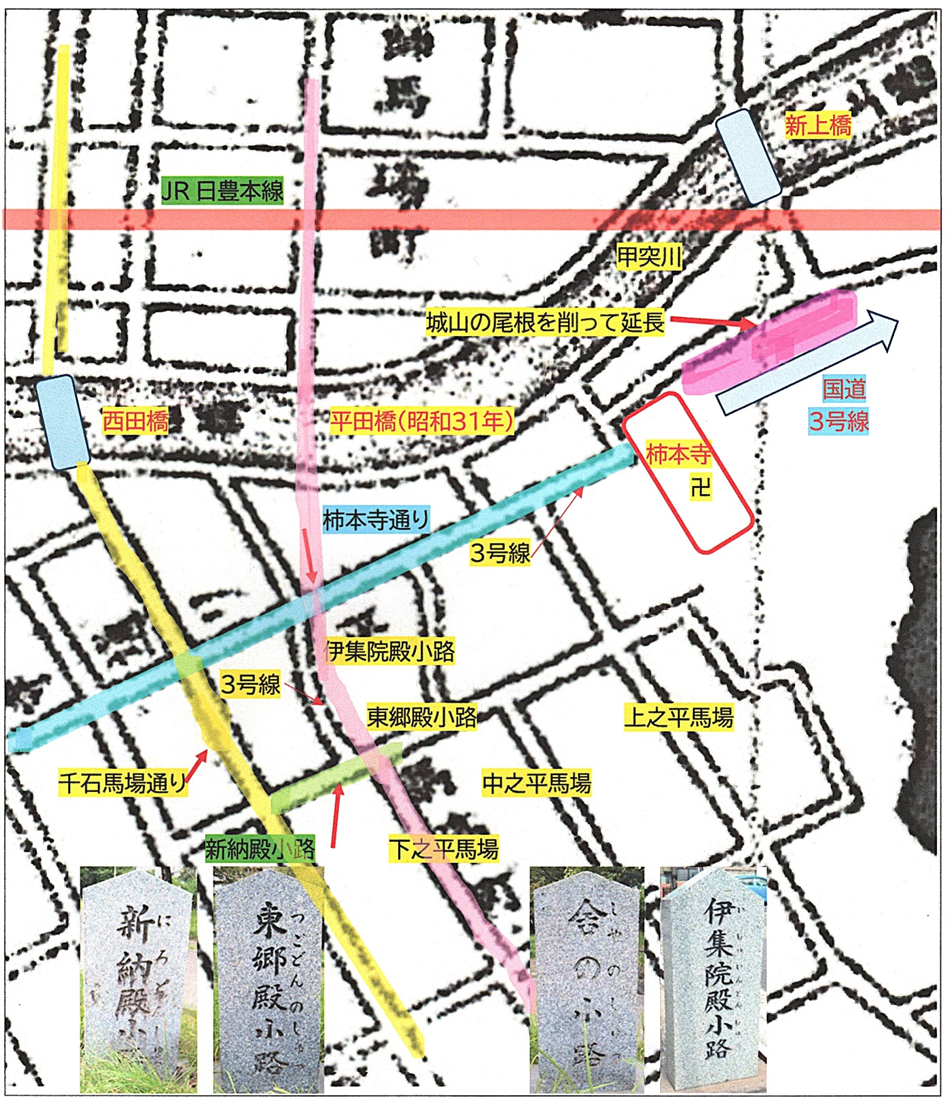 戦後の復興の中,柿本寺通りが延長され,ついには東京へと続く国道と一本につながっていきます。つまり始点である照国神社前の交差点は,国道3号・10号・225号・226号という4つの国道が交差する,まさに九州の大動脈となっています。